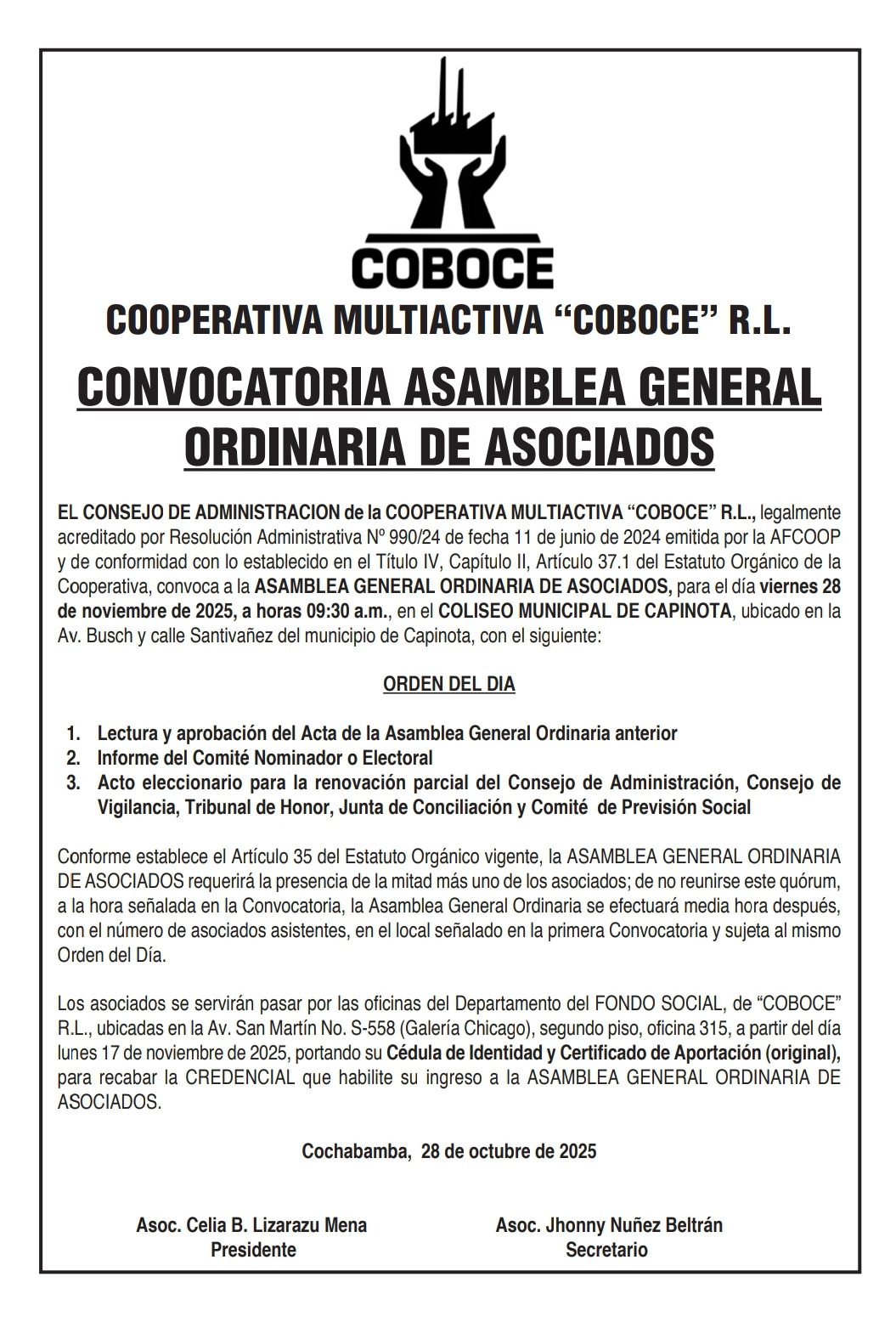 CONVOCATORIA ASAMBLEA GENERAL ORDINARIA